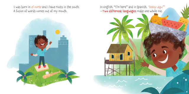 Mixon includes a few Spanish words in each spread, most of which are understandable in context or because of their similarity to an English equivalent. A glossary in the back of the book provides more definitions and information. The Spanish words make the rhyming, rhythmic language all the more fun to read aloud. The experience of another language getting mixed to English will be familiar to many families whether that language is Spanish or another one.