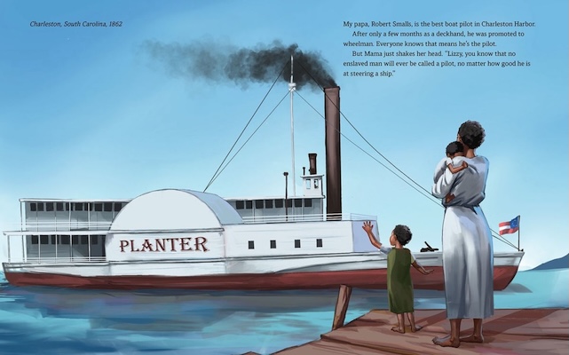 The book is a lovely item to hold. It welcomes readers with the ideas of freedom and dawn in the title and with the colors of a miraculous sunrise on the cover and title page, and echoed in the end papers. Back matter sections provide more information about the US Civil War and Smalls, who went on to fight on the Union side in the Civil War and later serve five terms in the US House of Representatives. I recommend Freedom at Dawn wholeheartedly to schools, libraries, and families who are looking for ways to introduce children to the painful-but-foundational history of slavery in the United States and who want to provide inspiration through a true story of courage and wit.