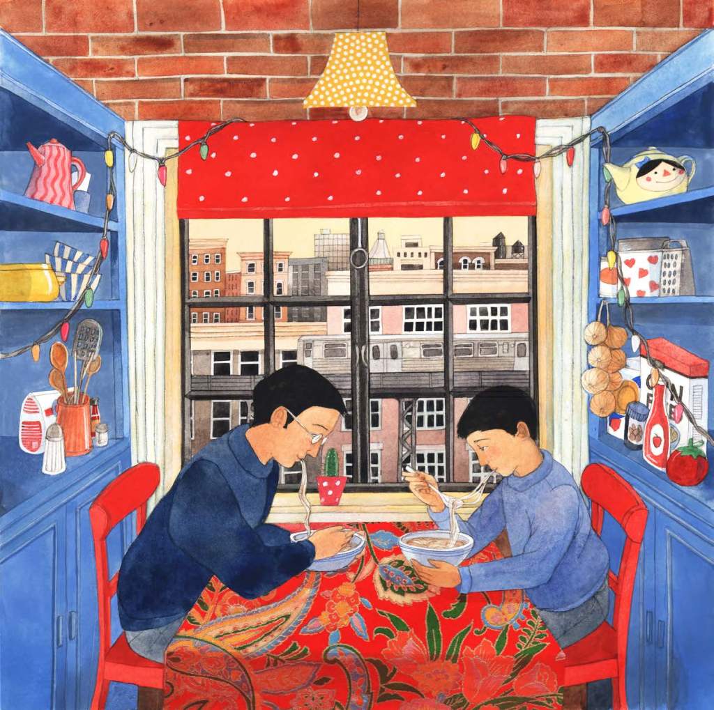 Helen Cann’s artwork is both rich with details and leaves plenty of white space. This works perfectly with the poetry to provide space to focus and notice the big feelings that small details can bring. The diverse aspect of this book depicted in the images is more through visible race than through clothing and customs.