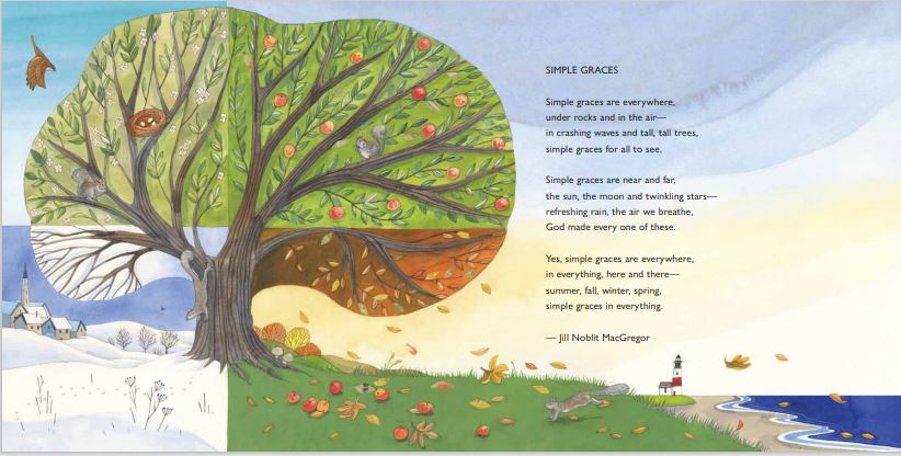 “Simple Graces” poem and illustration (full spread), For Every Little Thing, pp. 43–44