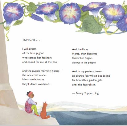 For Every Little Thing is the kind of book that has fed my lifelong love of picture books. It feels solid in my hands. Every spread has visual and verbal delights. It is fun both to open at random and to read in order and experience its structure. The poems are organized around themes such as “Morning,” “Love and Kindness,” “Family and Friends,” “Nightfall,” and “Dreams.”