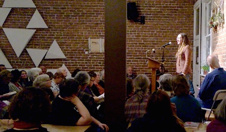 Karin reciting her poem “cracks” from The 2017 Richmond Anthology of Poetry at its book launch party, Kaleidoscope Cafe, Richmond, CA, December 2016. (Photo by Stephen A. Fisher)